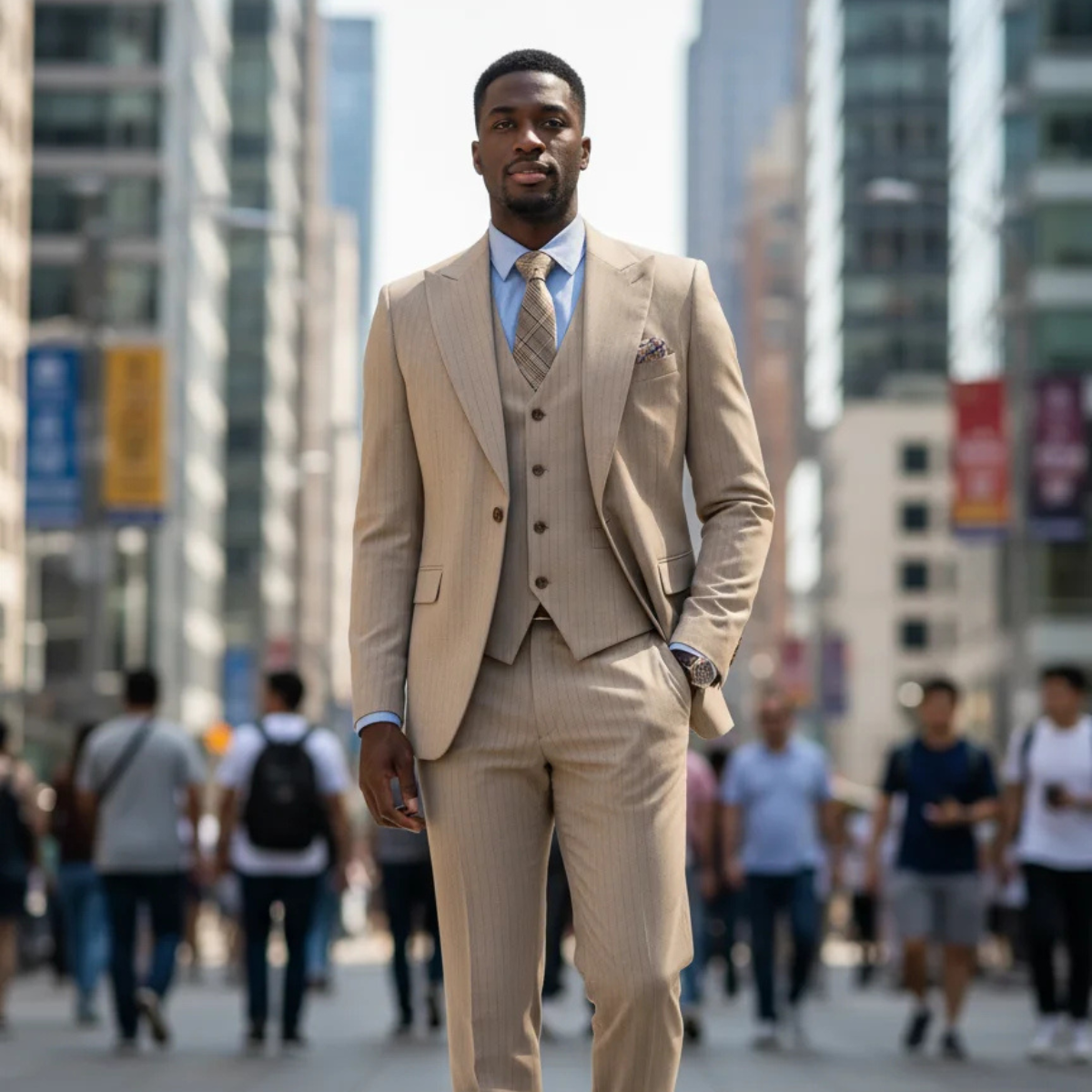 Crafted from premium fabric with a subtle pinstripe texture, this 3-piece set includes a perfectly fitted blazer, a matching waistcoat, and tailored trousers. The structured cut enhances your silhouette, offering confidence and comfort from business meetings to formal events.